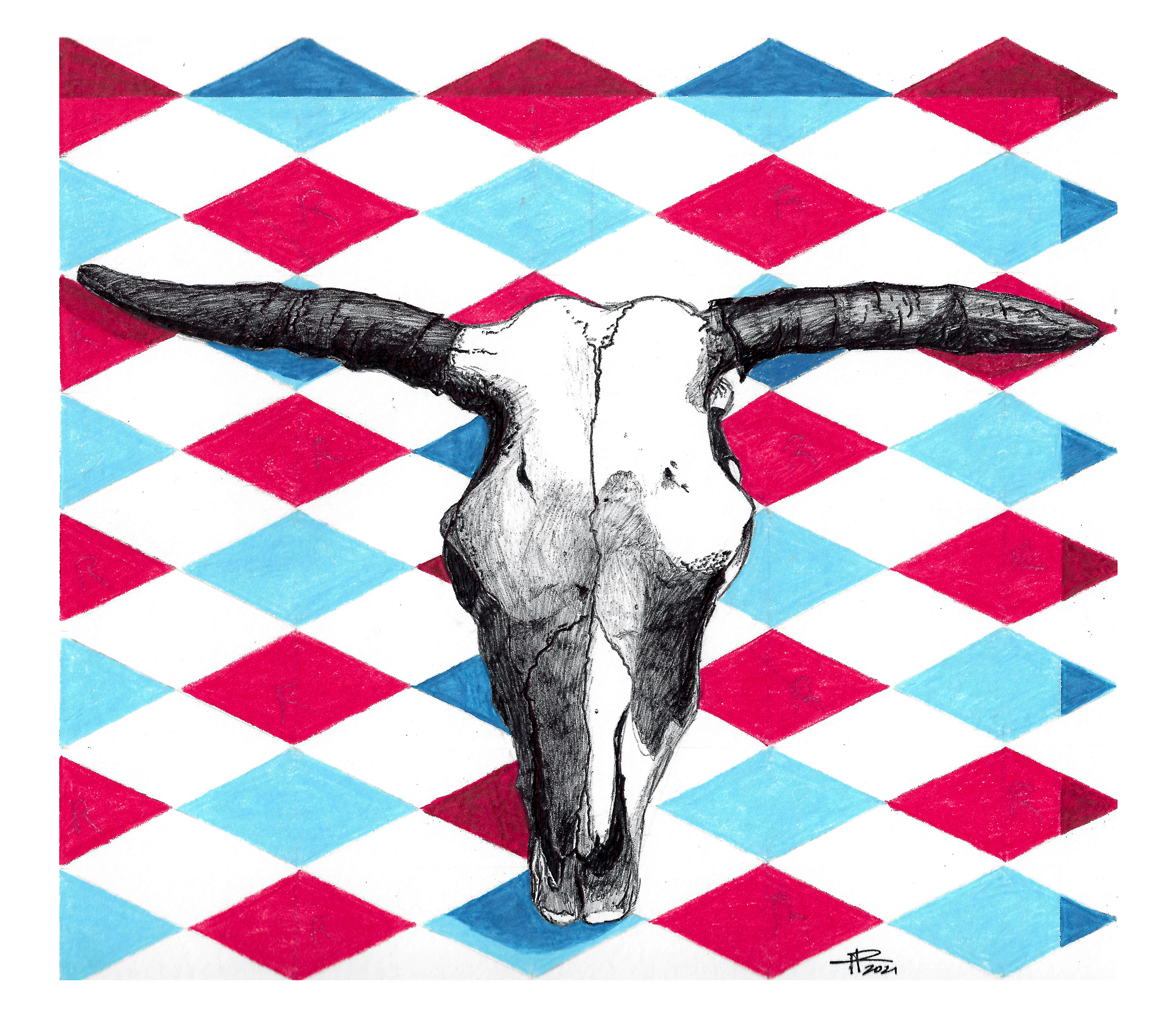 Argyle_082021 on August 20, 2021October 28, 2024 By dragonilia A drawing of a bull skull on an argyle pattern